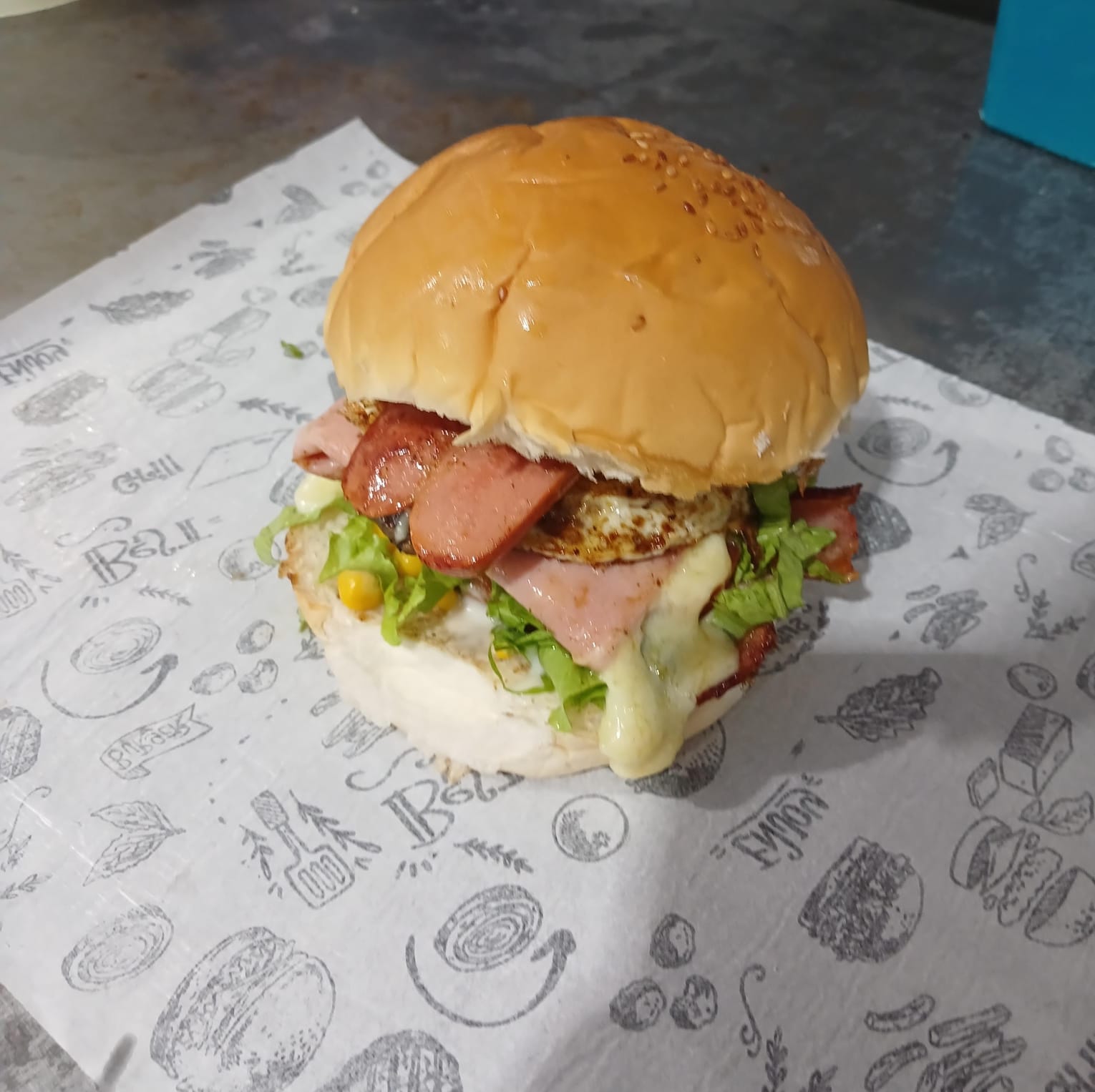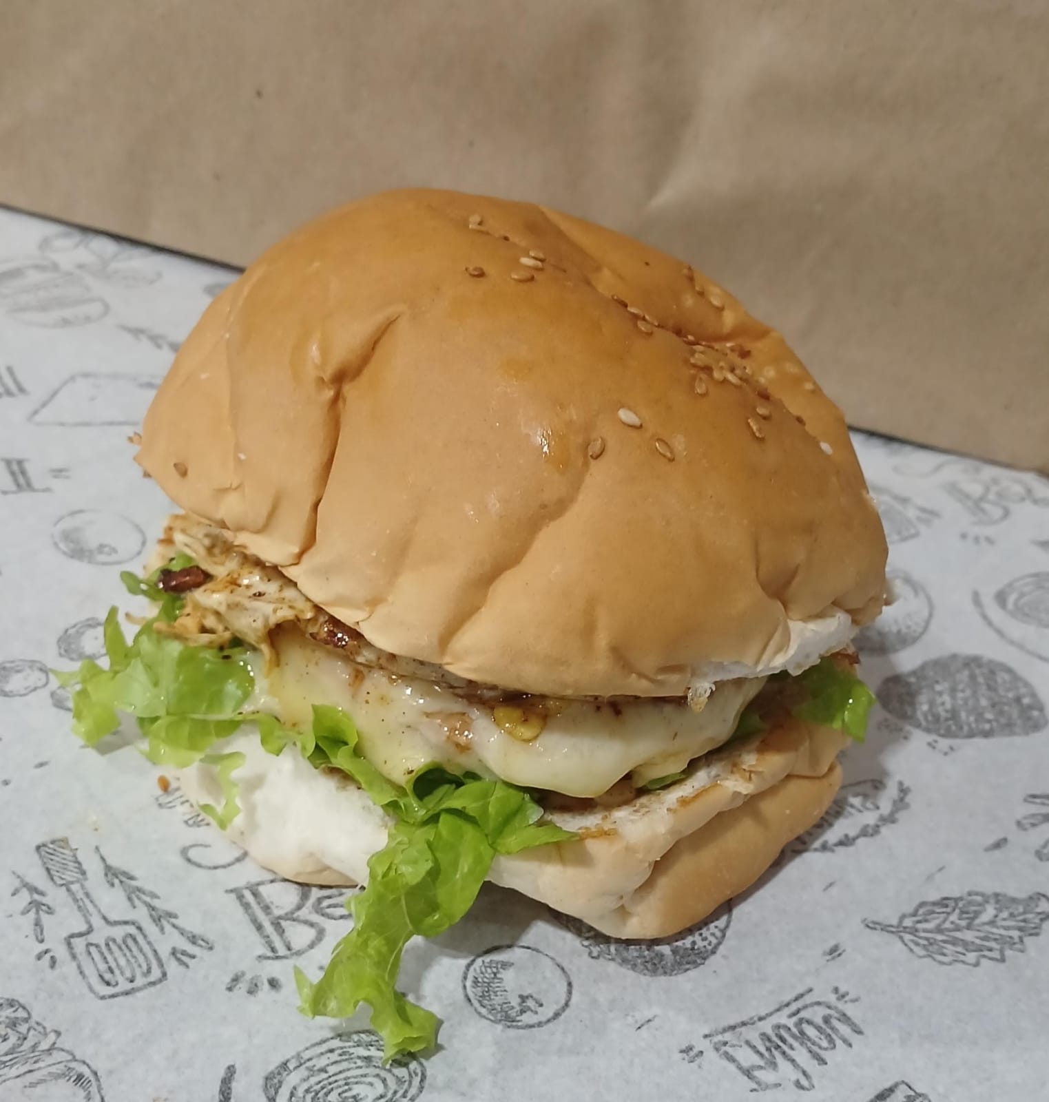 Pão, Hamburguer de Frango, Picles, Alface, Tomate, Mussarela, Maionese e Ovo.
