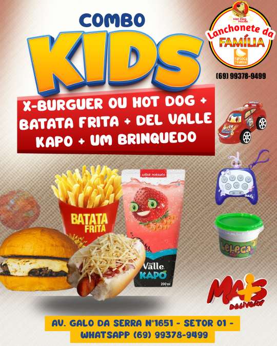 1 Lanche (X-Burguer ou Hot Dog Paulistinha), 1 Batata Frita P, 1 suco kapo + 1 brinquedo