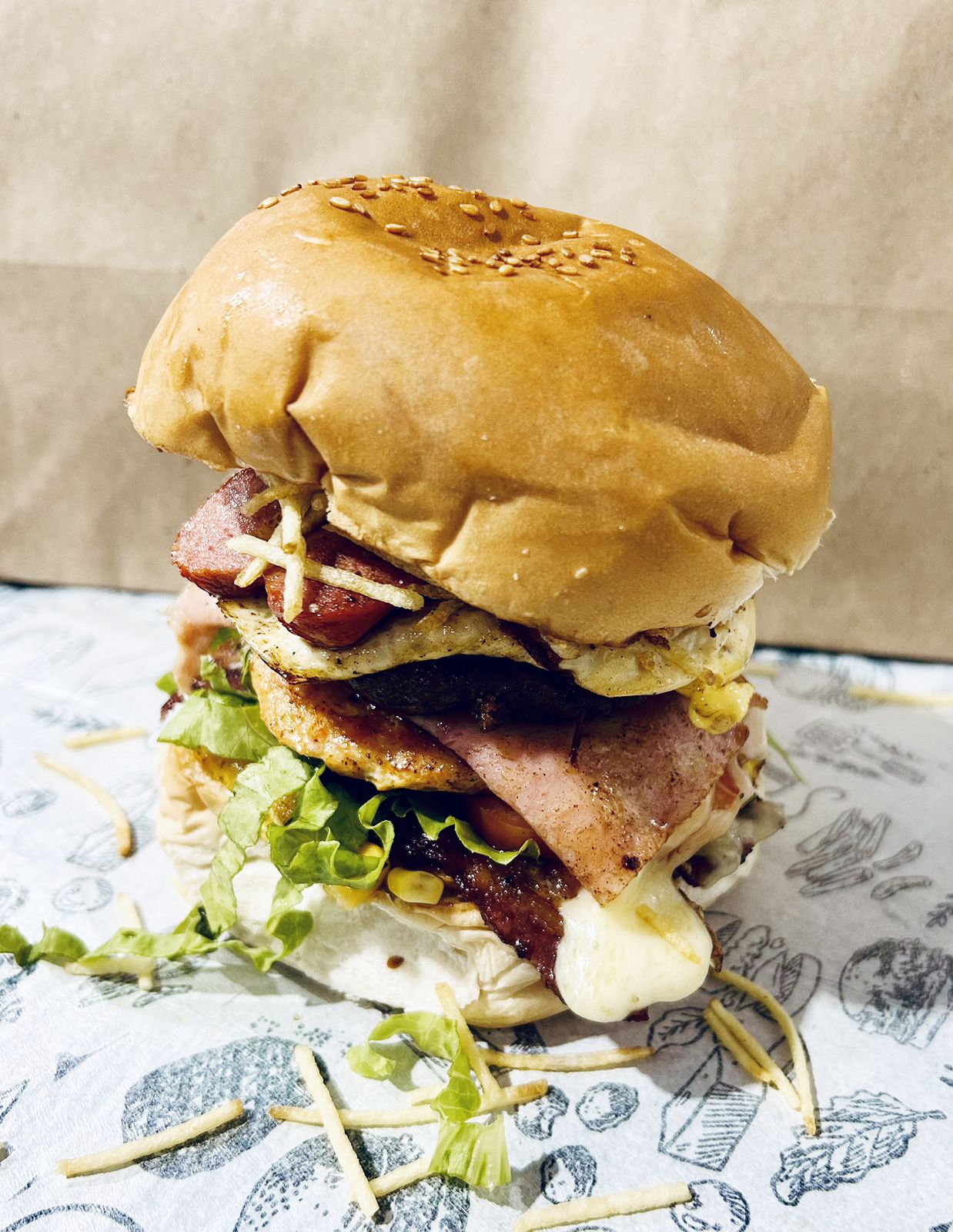 Pão, salsicha, molho, milho, catupiry, batata palha, bacon e calabresa.