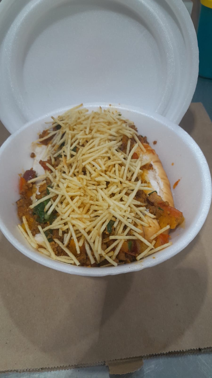 Pão, salsicha, molho, milho, catupiry, batata palha e carne moída.