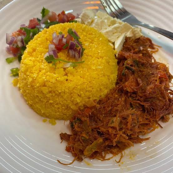 Cuscuz com carne seca, tomate e cheiro verde.